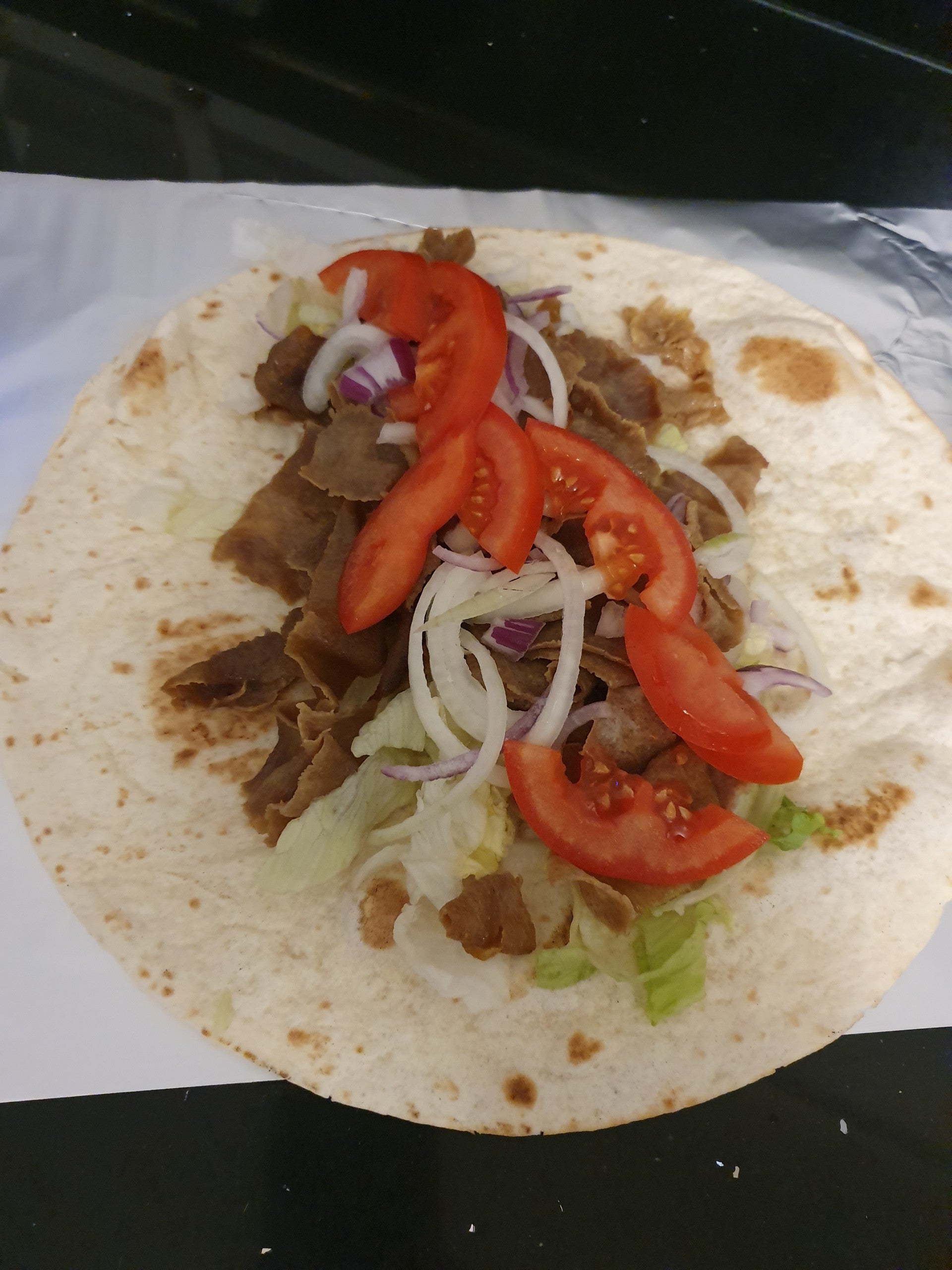 Tosti Wrap, Sla, Tomaten, Ui, Vlees naar keuze & Saus naar keuze.